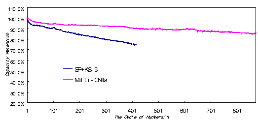 Using our Conductive Nanotubes Composite Additive, the cycle life of 700mAh053048 Li-ion battery can prolonged one more time, see table 1 details below